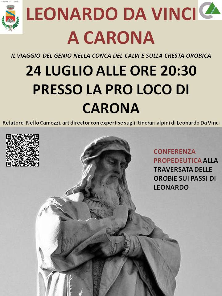 Mercoledì 24 luglio alle 20,30 presso la Pro Loco di Carona appuntamento con Leonardo da Vinci: il viaggio del genio nella Conca del Calvi e sulla Cresta Orobica.