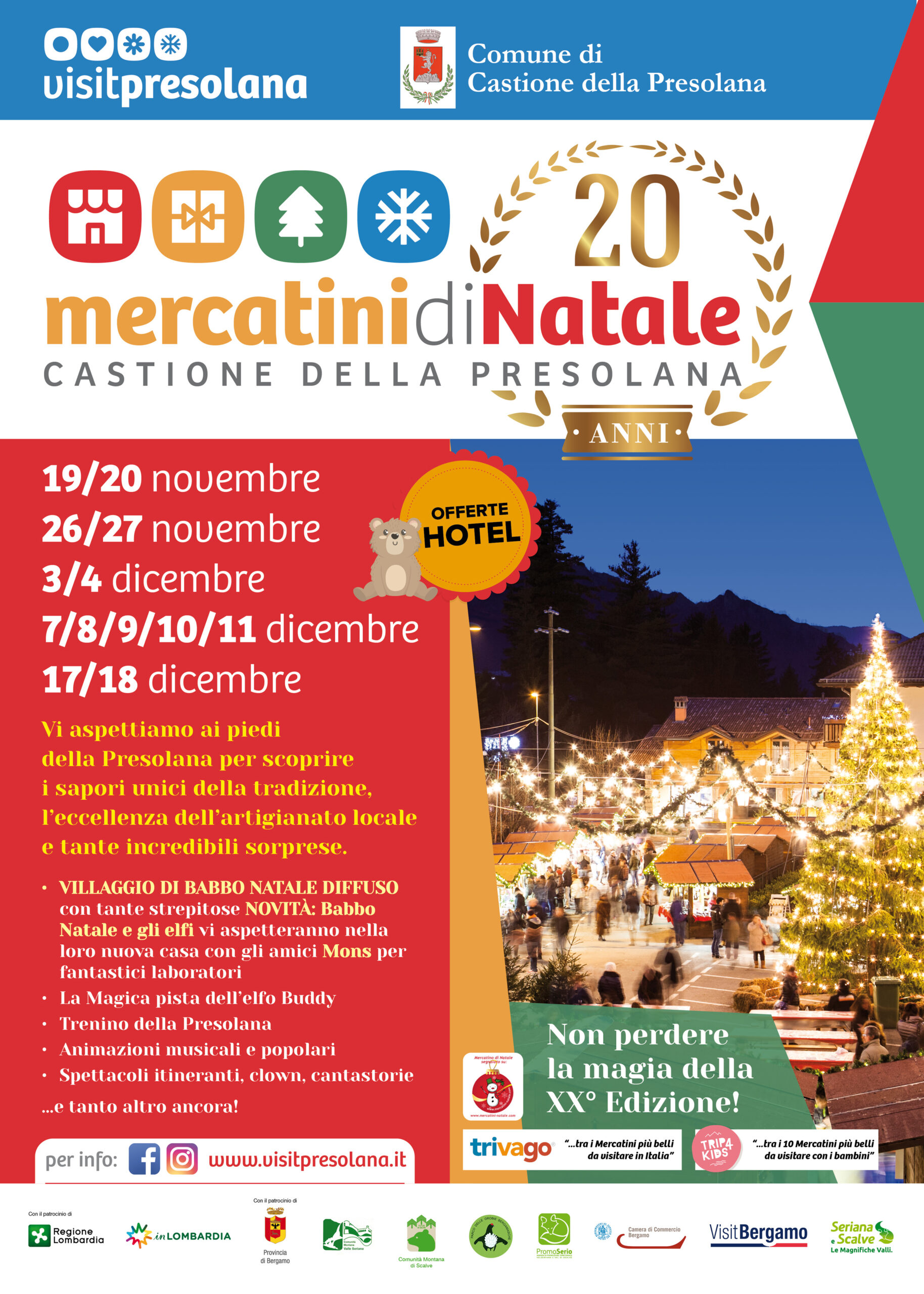 Sempre di più i mercatini di Natale di Castione vanno oltre lo shopping, seppur selezionatissimo e di qualità. Al cospetto delle Alpi Orobie, in una coreografia di grande atmosfera anche quest’anno un vivace programma di concerti, cori. rievocazioni dimostrazione di antichi mestieri, che raccontano non solo la storia fiabesca del Natale, ma anche quella spesso dura seppur dolcissima della laboriosa e fiera del nostro territorio.