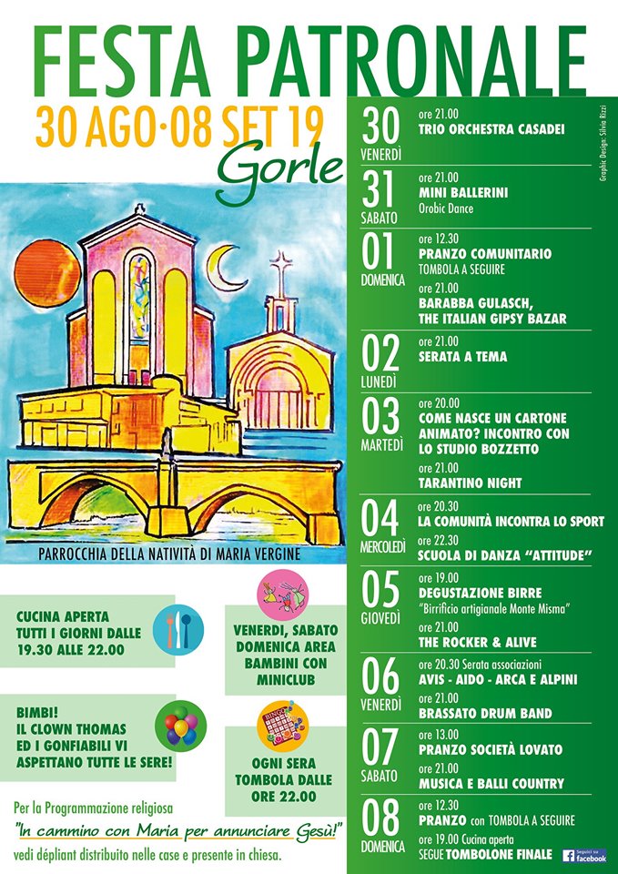 Dal 30 agosto all'8 settembre a Gorle avrà luogo la festa patronale. Ogni sera, dalle 19,30 alle 22, cucina aperta; per i bambini tutte le sere i gonfiabili e il Clown Thomas garantiranno divertimento assicurato e per i più grandi ogni sera alle 22 ci sarà una tombolata con ricchi premi. Il venerdì, sabato e domenica inoltre sarà disponibile il miniclub per i più piccoli.