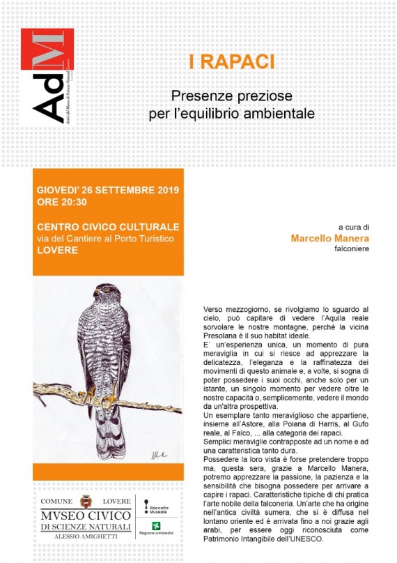 Giovedì 26 Settembre Manifestazioni / Corsi I rapaci EVENTO CONCLUSO Il Centro Civico Culturale ospita un incontro tenuto dal falconiere Marcello Manera dal titolo «I rapaci. Presenze preziose per l'equilibrio ambientale». Informazioni Prezzo: ingresso libero Organizzatore Comune di Lovere Data e Ora Inizio: giovedì 26 settembre 2019 20:30 Giorni di apertura L M M G V S D Documenti Locandina Luogo Lovere Eventi Consigliati 8 Sab Novembre h.20:45 / 23:00 Cinema Teatro Crystal Lovere Volevo essere Marlon Brando Al via la 23esima edizione della stagione teatrale al Teatro Crystal di Lovere con Alessandro Haber, nel doppio appuntamento di sabato e domenica. Uno spettacolo che ripercorre la carriera dello storico attore. 9 Dom Novembre h.16:00 / 18:00 Cinema Teatro Crystal Lovere Volevo essere Marlon Brando Prosegue la 23esima edizione della stagione teatrale al Teatro Crystal di Lovere con Alessandro Haber, nel doppio appuntamento di sabato e domenica. Uno spettacolo che ripercorre la carriera dello storico attore. 10 Sab Gennaio h.20:45 / 23:00 Cinema Teatro Crystal Lovere Don Chisciotte Prosegue la 23esima edizione della stagione teatrale al Teatro Crystal di Lovere con Compagnia Marionettistica Carlo Colla & Figli, nel doppio appuntamento di sabato e domenica. Uno spettacolo tratto dal capolavoro di Cervantes. 11 Dom Gennaio h.16:00 / 18:00 Cinema Teatro Crystal Lovere Don Chisciotte Prosegue la 23esima edizione della stagione teatrale al Teatro Crystal di Lovere con Compagnia Marionettistica Carlo Colla & Figli, nel doppio appuntamento di sabato e domenica. Uno spettacolo tratto dal capolavoro di Cervantes. 20 Sab Dicembre h.20:45 / 23:30 Cinema Teatro Crystal Lovere Sior Todero Brontolon Prosegue la 23esima edizione della stagione teatrale al Teatro Crystal di Lovere con Franco Branciaroli, nel doppio appuntamento di sabato e domenica. Uno spettacolo tratto dal capolavoro di Carlo Goldoni. 21 Dom Dicembre h.16:00 / 18:30 Cinema Teatro Crystal Lovere Sior Todero Brontolon Prosegue la 23esima edizione della stagione teatrale al Teatro Crystal di Lovere con Franco Branciaroli, nel doppio appuntamento di sabato e domenica. Uno spettacolo tratto dal capolavoro di Carlo Goldoni. 13 Sab Dicembre h.15:00 / 16:00 Cinema Teatro Crystal Lovere Stagione del Teatro Crystallino Torna per la terza edizione la stagione teatrale al Teatro Crystal di Lovere dedicata ai più piccoli. In programma, da dicembre a febbraio 2026, diversi spettacoli per vivere la magia del teatro. 13 Sab Dicembre h.15:00 / 16:00 Cinema Teatro Crystal Lovere La conta di Natale Per la terza edizione del «Teatro Crystallino», la stagione teatrale al Teatro Crystal di Lovere dedicata ai più piccoli, appuntamento con uno spettacolo di teatro di narrazione e pupazzi. ×