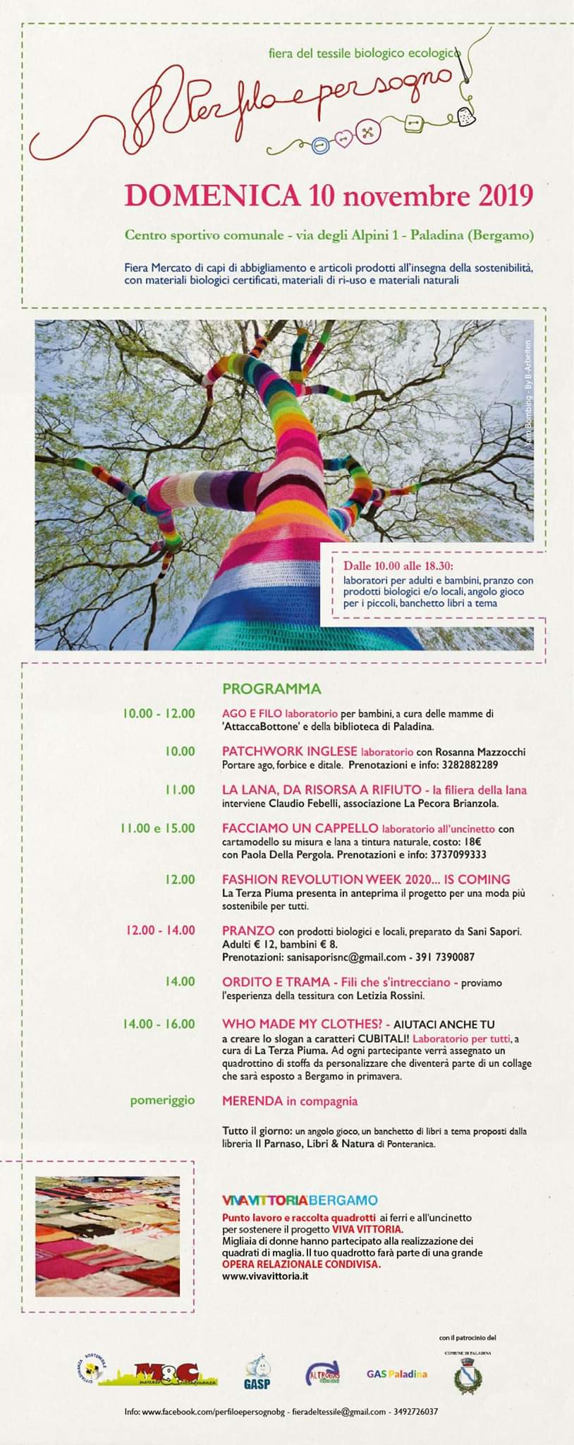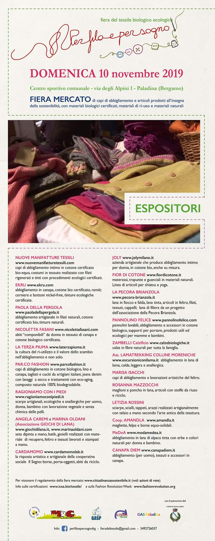 La manifestazione prevede la partecipazione di diciotto tra produttori, artigiani e hobbisti che propongono articoli tessili realizzati con materie prime e lavorazioni che rispettano l'ambiente e il lavoro, e articoli da ri-ciclo.