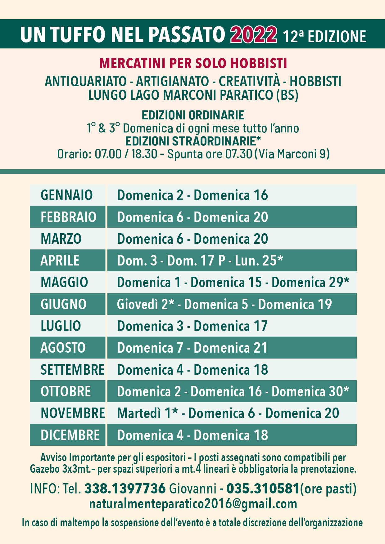 In caso di mal tempo la sospensione dell'evento è a totale discrezione dell'organizzatore.