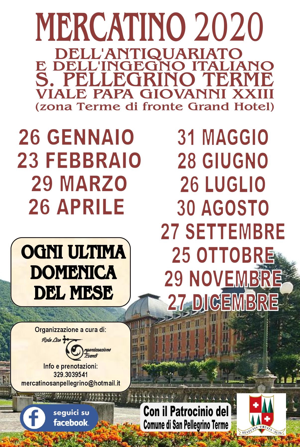 Anche nel 2020 torna l'ormai tradizionale mercatino dell'antiquariato e dell'ingegno italiano a San Pellegrino Terme. Si terrà come di consuetudine lungo Viale Papa Giovanni XXIII ogni ultima domenica del mese.