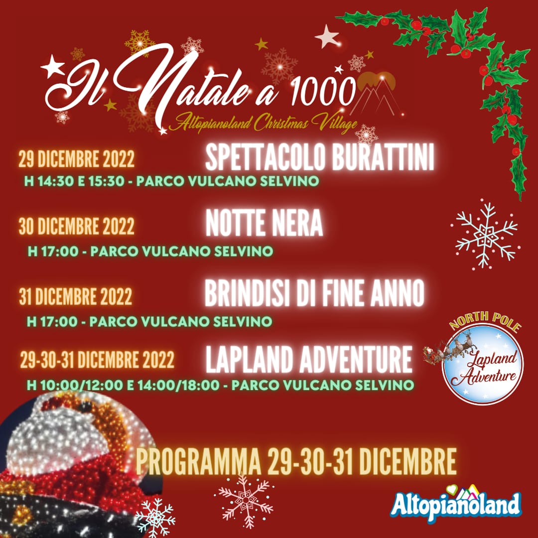 Per Natale a 1000, il centro di Selvino sarà sede dell’Altopianoland Christmas Village con diverse attività dedicate soprattutto ai più piccoli, dove giochi e strutture luminose faranno vivere un magico sogno ai turisti che frequentano l'Altopiano.