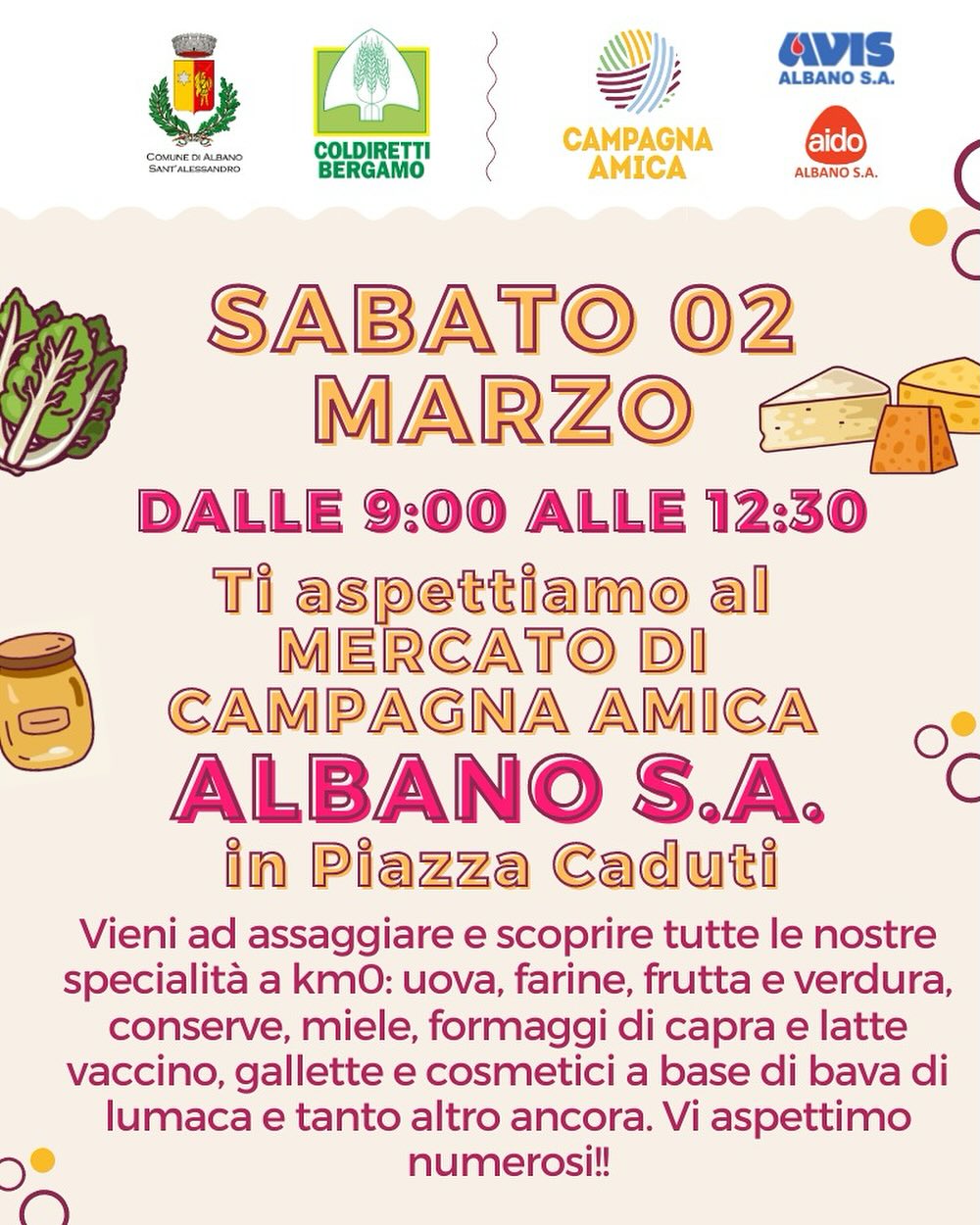 Il comune di Albano Sant'Alessandro organizza il mensile appuntamento del mercato agricolo di Campagna Amica sabato 2 marzo in Piazza Caduti.