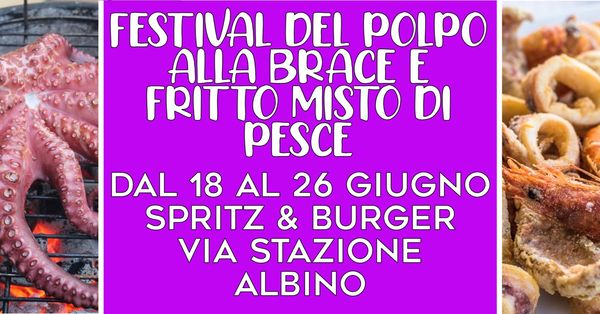 Dal 18 al 26 Giugno 2022 va in scena presso lo Spritz&Burger di Albino il festival del Polpo alla Brace e del Fritto Misto di Pesce, il format itinerante che negli ultimi tre anni ha conquistato piazze, parchi e location di tutta Italia!