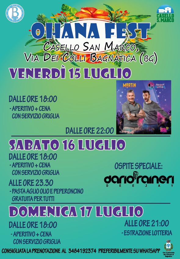 Nella suggestiva location del Casello San Marco, le associazioni APS Gruppo Giovani Bagnatica e Casello San Marco organizzano la settima edizione dell'Ohana Fest. Qui potrete consumare, in una bellissima zona pedocollinare, aperitivo con servizio griglia e non solo, il tutto contornato da musica e tanto divertimento. Le serate inizieranno il venerdì sera in compagnia di dj Martin e Jonny Mele direttamente da Radio 105, mentre il sabato sera suonerà per noi Dario Ranieri dj. Il sabato sera dalle 23.30 sarà offerta pasta aglio olio e peperoncino, mentre la domenica sera alle ore 21.30 vi sarà l'estrazione della lotteria con fantastici premi.