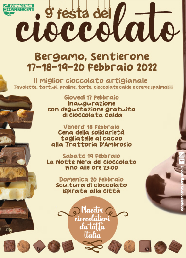 Dal 17 al 20 febbraio tornano sul Sentierone i maestri cioccolatieri da tutta Italia: sculture di cioccolato, degustazioni, golose tavolette, tartufi, praline, torte, cioccolate calde e tagliatelle al cacao.