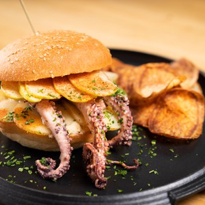 Martedì 22 settembre: hamburger di polpo con chips e Franciacorta.