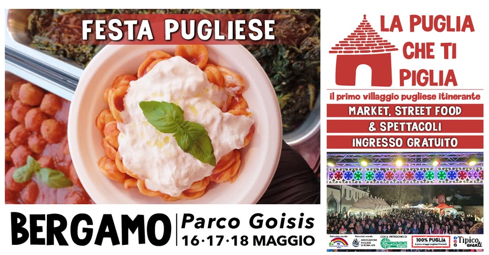 Tipico Eventi approda per la prima volta a Bergamo con uno dei format più amati di sempre: “La Puglia che ti piglia – 100% Puglia”, il primo villaggio pugliese itinerante che fa tappa nel cuore della città, trasformando Parco Goisis (nell’area del parcheggio di via Buttaro) in un angolo autentico del Sud. Per tre giornate – da venerdì 16 a domenica 18 maggio – il parco sarà avvolto da un’atmosfera suggestiva e festosa, grazie a scenografie tipiche come i trulli, gli ulivi e le immancabili luminarie pugliesi, capaci di evocare i colori, i profumi e la magia della Puglia più vera. Protagonista indiscusso sarà ovviamente il cibo di strada: presenti i migliori street chef pugliesi, pronti a servire piatti tradizionali – dolci e salati – per soddisfare tutti i palati. A completare l’offerta gastronomica, una selezione di birre artigianali pugliesi, un’area tavoli attrezzata per gustare il proprio pasto in tutta comodità e numerosi banchi di prodotti enogastronomici per portare a casa un pezzo di Puglia.