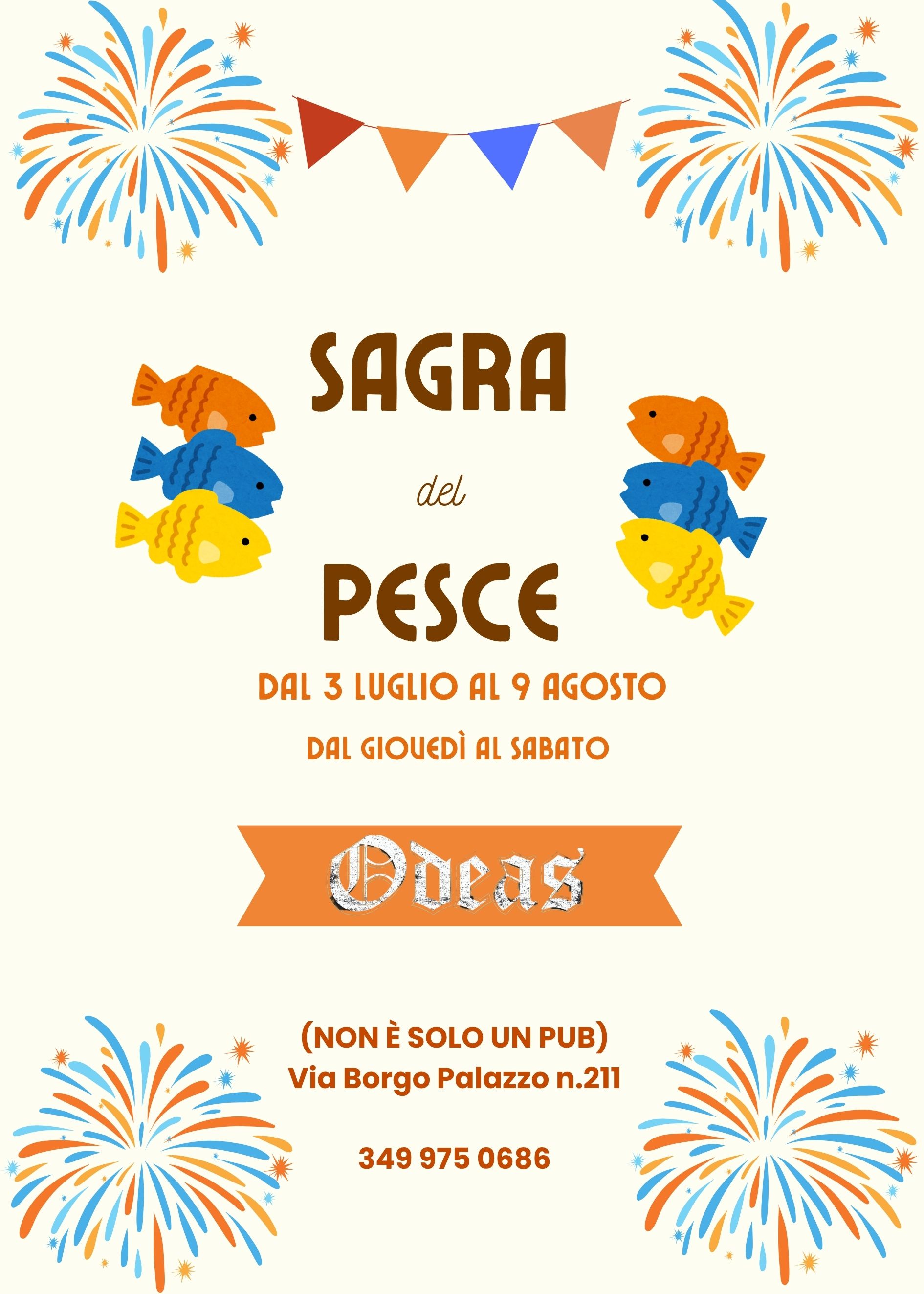 Dal 3 luglio al 9 agosto lo storico Pub Odeas si traveste da Sagra del Pesce. Dal giovedรฌ al sabato sera potrete gustare fritto di calamari, acquardelle, fish & chips, moscardini in umido, Polpo Burger e tanto altro.