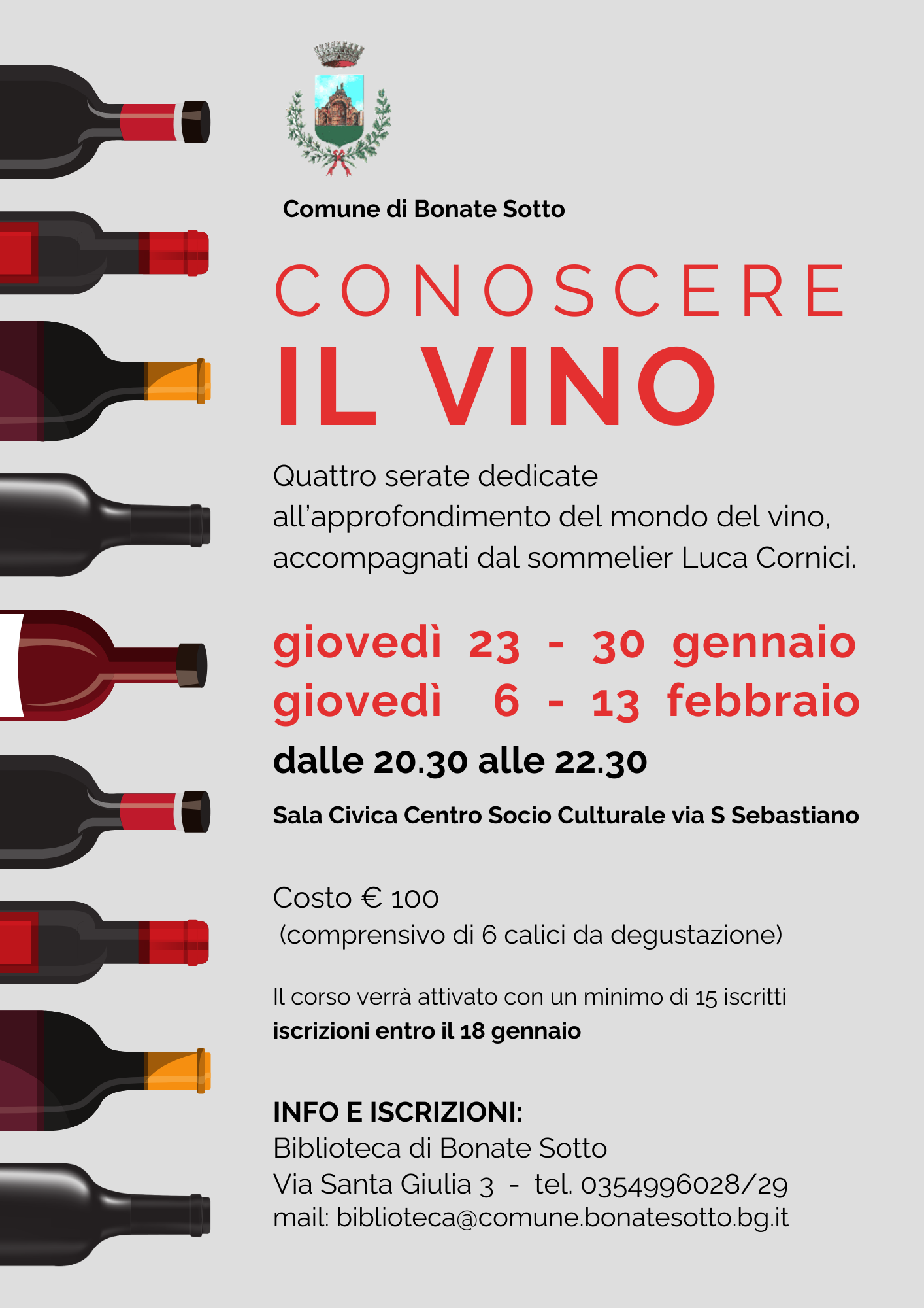 Il corso si articola in quattro serate, per un'approfondimento sulla cultura del vino, la sua storia, le varietà di uva, i metodi di produzione e le tecniche di degustazione, per imparare a riconoscere e apprezzare le diverse sfumature di questo straordinario prodotto.