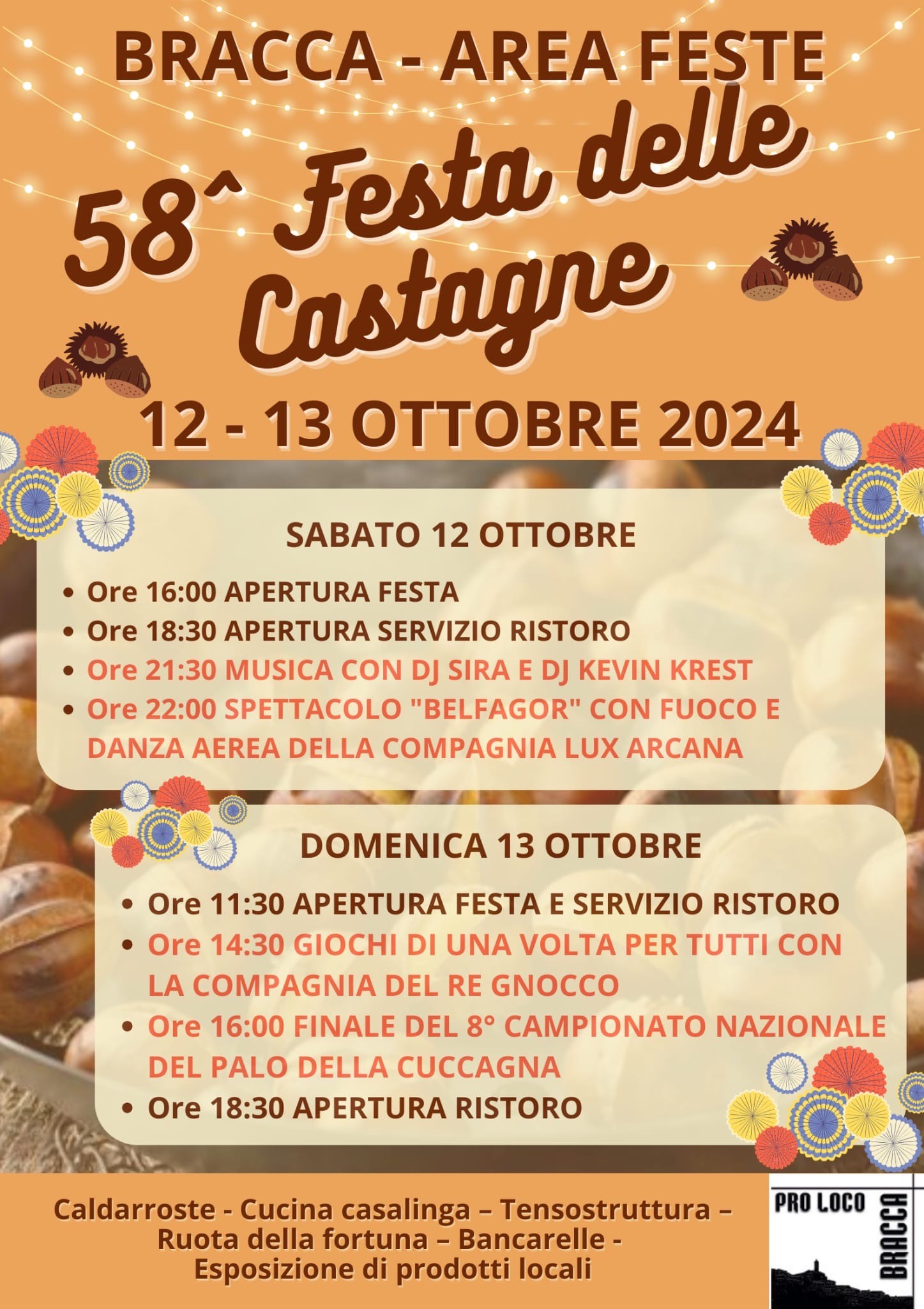 Bracca si veste a festa per celebrare l'autunno. Torna anche quest'anno la tradizionale Festa delle Castagne di Bracca, giunta alla sua 58a edizione. Due giorni dedicati al gusto, al divertimento e alla tradizione, con un ricco programma di eventi per tutte le età.