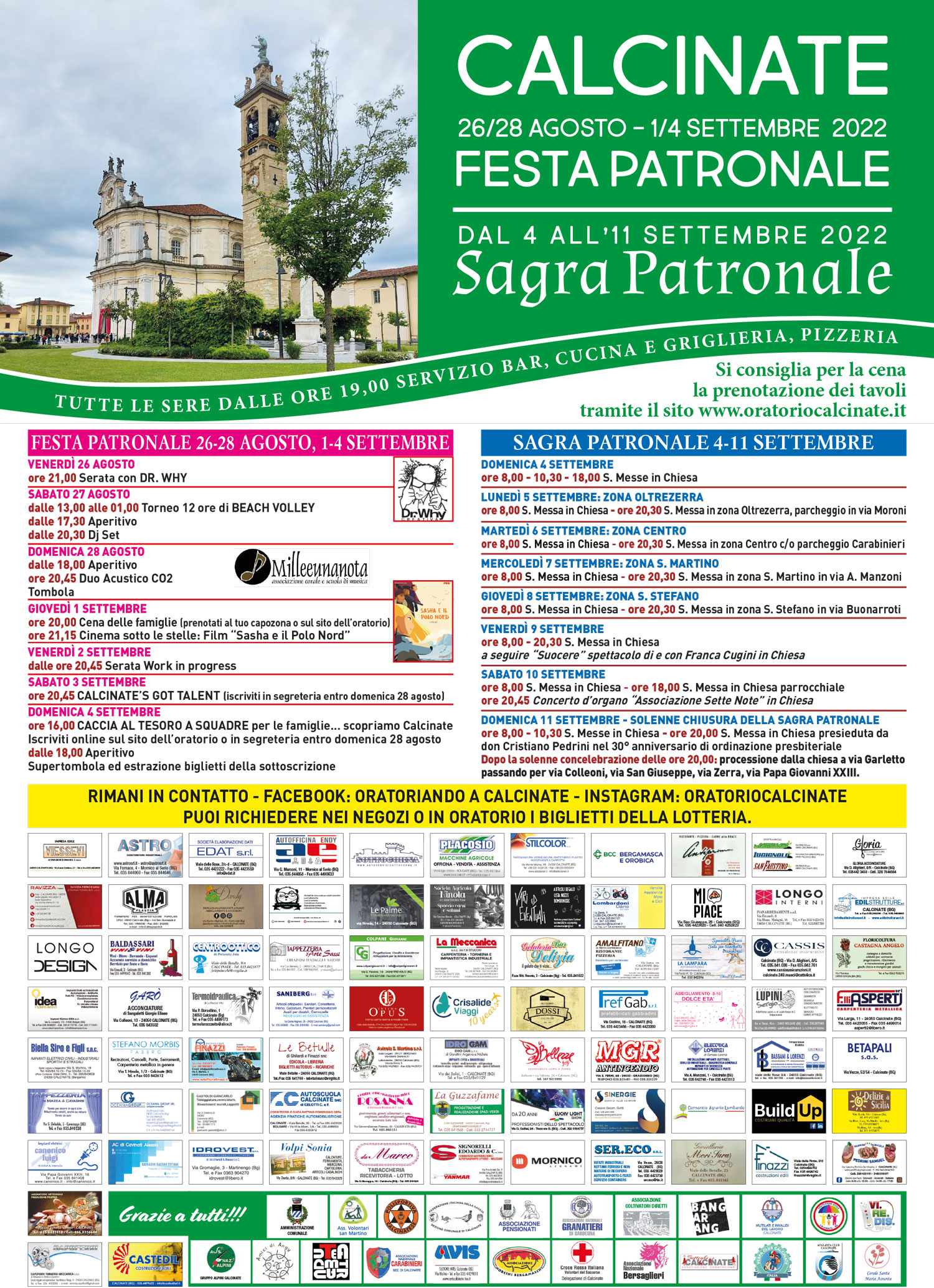 L'oratorio Calcinate di calcinate organizza la festa patronale dal 26 al 28 agosto e dal 1 al 4 settembre; a seguire ci sarร la sagra patronale dal 4 al 11 agosto.