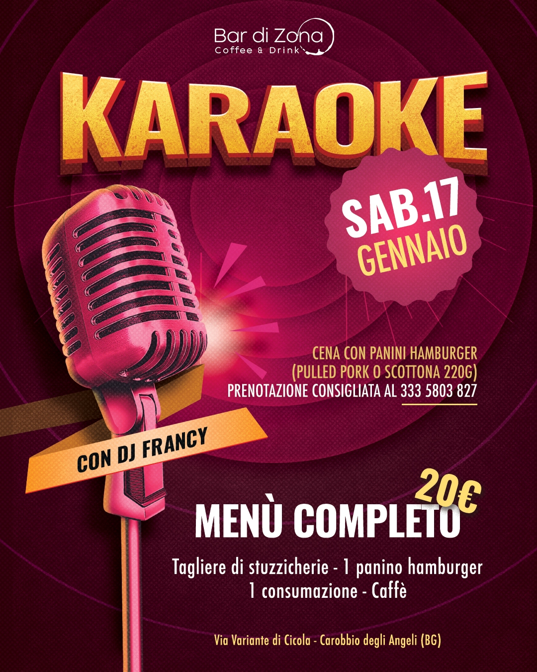 Serata karaoke al Bar di Zona di Carobbio degli Angeli. Sabato 17 gennaio spazio al divertimento con microfono aperto e selezione musicale a cura di DJ Francy.