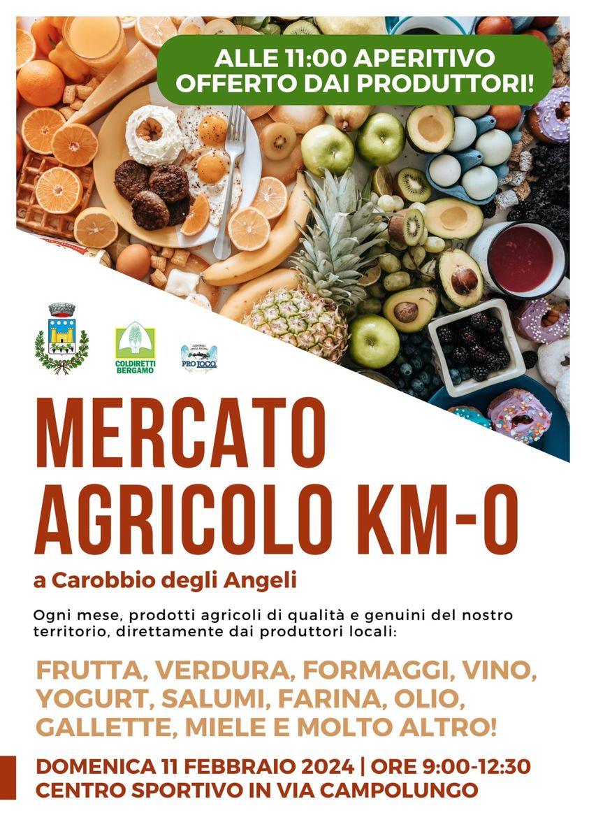 Il comune di Carobbio degli Angeli invita domenica 11 febbraio dalle 9:00 alle 12:30 presso il Centro Sportivo aspettiamo numerosi per il mercatino agricolo a km 0 e alle 11:00 aperitivo offerto dai produttori!