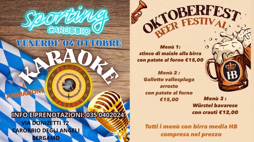 Questa sera lo Sporting di Carobbio si trasforma in una vera e propria festa bavarese. Karaoke, animazione e tanta birra! Non perdete l'occasione di cantare le tue canzoni preferite e gustare le specialità bavaresi.