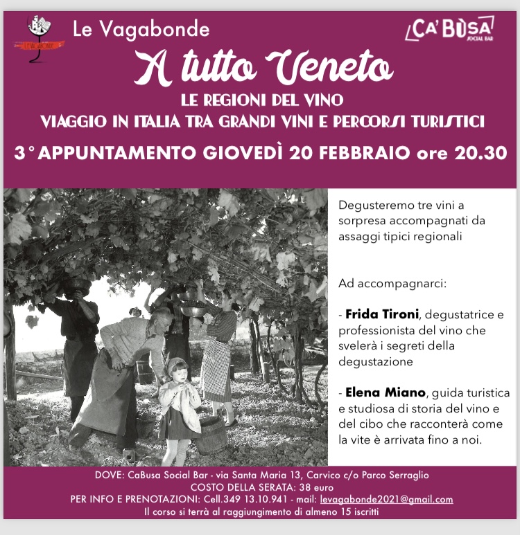 Terzo appuntamento a Carvico presso Cabusa social bar con l’associazione di Promozione sociale Le Vagabonde che ormai da alcuni anni organizza serate e appuntamenti di degustazione di vini e prodotti, presentando territori, parlando di storia e tradizioni e di percorsi turistici. Di cose buone e belle da scoprire.
