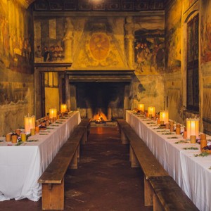 Una cena in stile XV secolo nella suggestiva Sala dei Banchetti con pietanze, arredi e stoviglie d’epoca. Ogni piatto, viene introdotto dal Gran Siniscalco che ne spiega l’origine e allieta i commensali con curiosità sugli antichi usi e costumi.