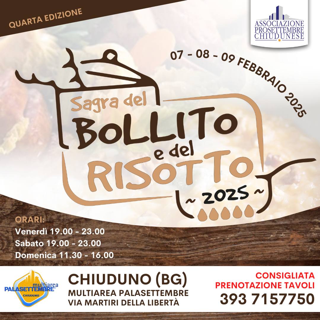 Dal 7 al 9 febbraio, il Palasettembre si trasformerà in un vero e proprio tempio della gastronomia locale con la Sagra del Bollito e del Risotto! Un appuntamento imperdibile per tutti gli amanti della buona cucina e delle tradizioni culinarie.