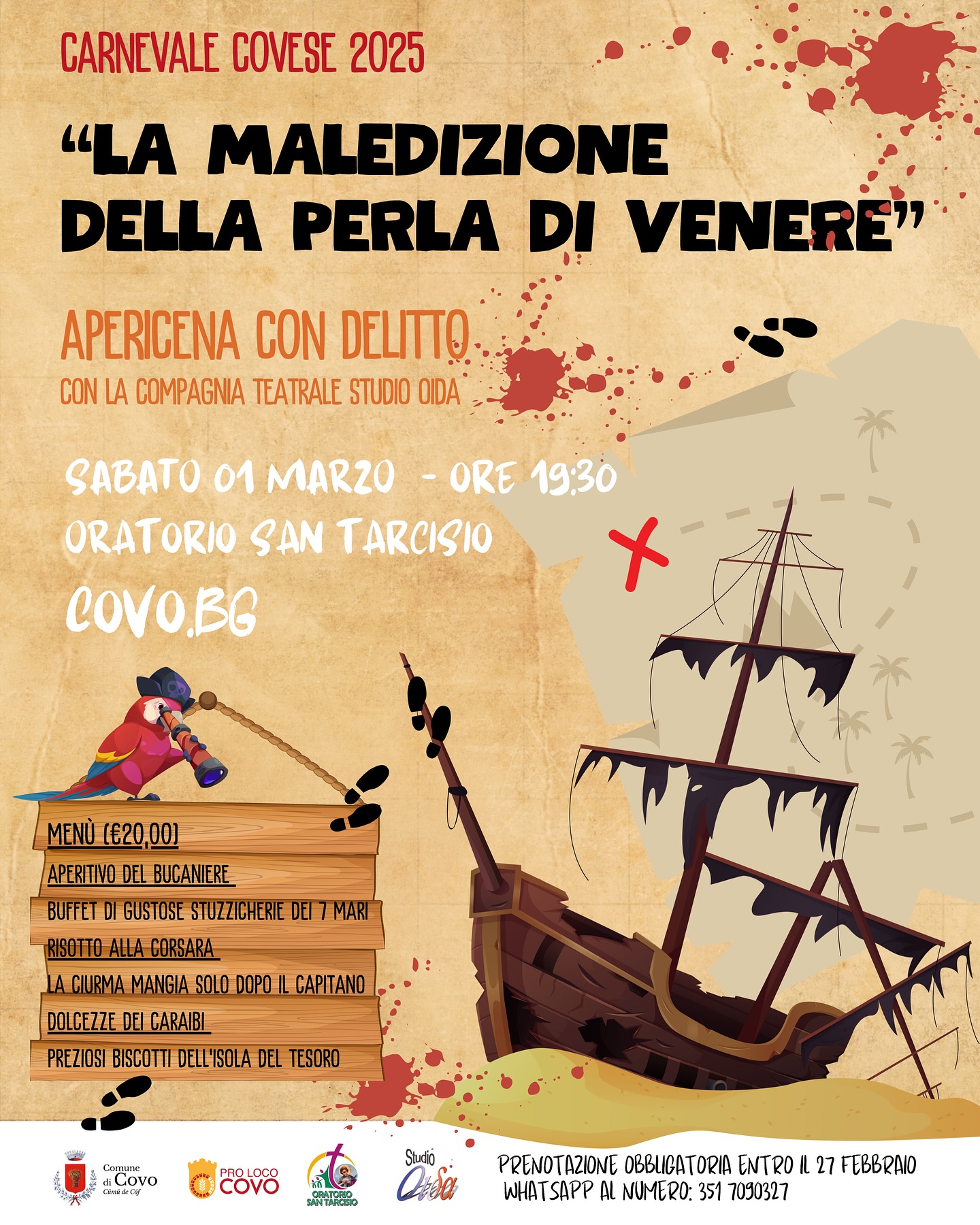 Sabato 1 marzo, l'Oratorio San Tarcisio di Covo ospiterà un evento unico: l'apericena con delitto "La maledizione della Perla di Venere".Organizzato dalla Pro Loco di Covo, in collaborazione con la compagnia teatrale Studio Oida, l'evento prevede una cena a tema caraibico e un coinvolgente gioco di ruolo in cui i partecipanti dovranno risolvere un misterioso delitto.L'iniziativa si inserisce nel ricco programma del Carnevale Covese, offrendo un'opportunità di divertimento e socializzazione in un'atmosfera unica.