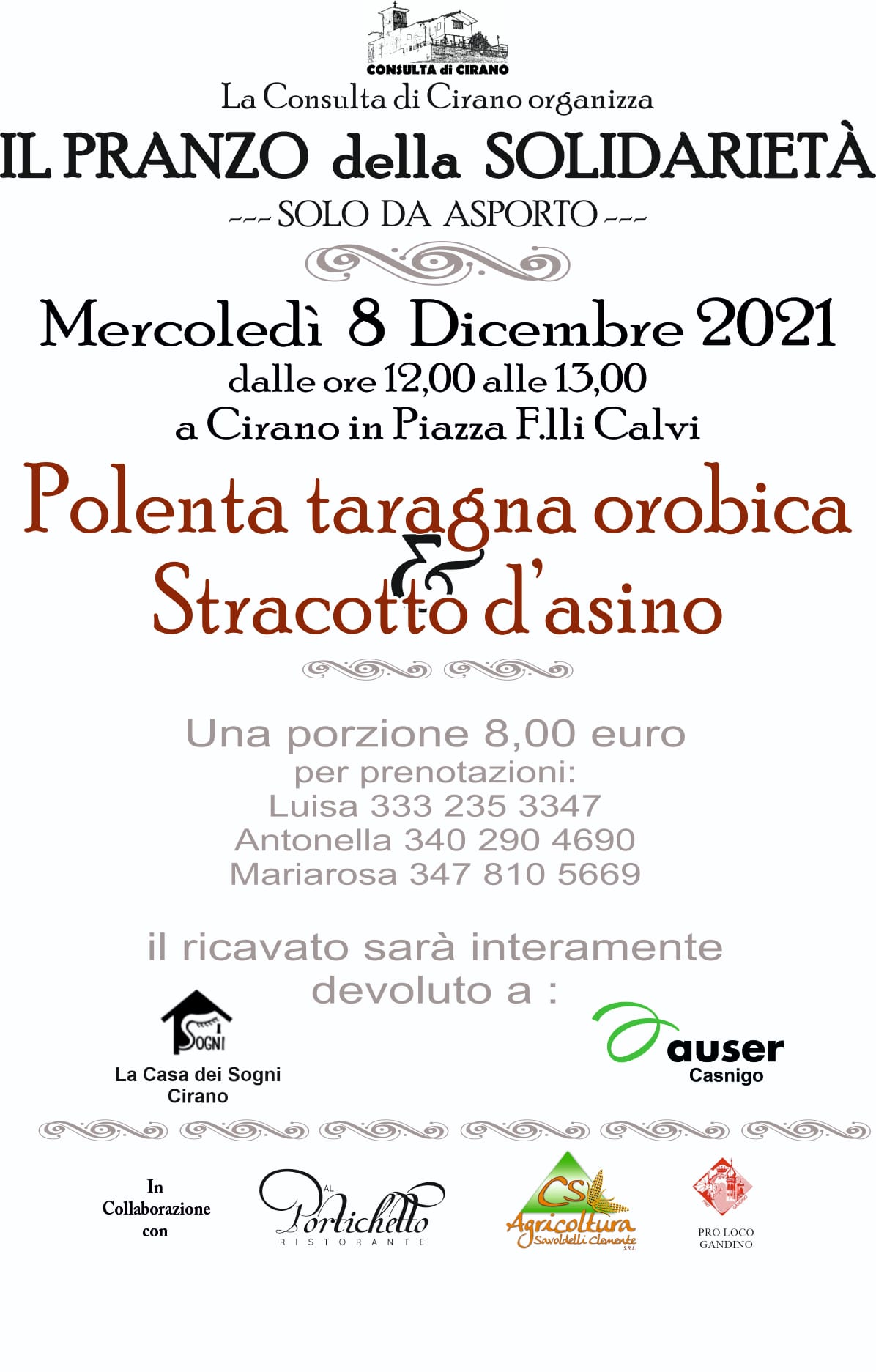 La Consulta di Cirano organizza "Il pranzo della solidarietà": verrà servita, solo da asporto, polenta taragna orobica e stracotto d'asino.