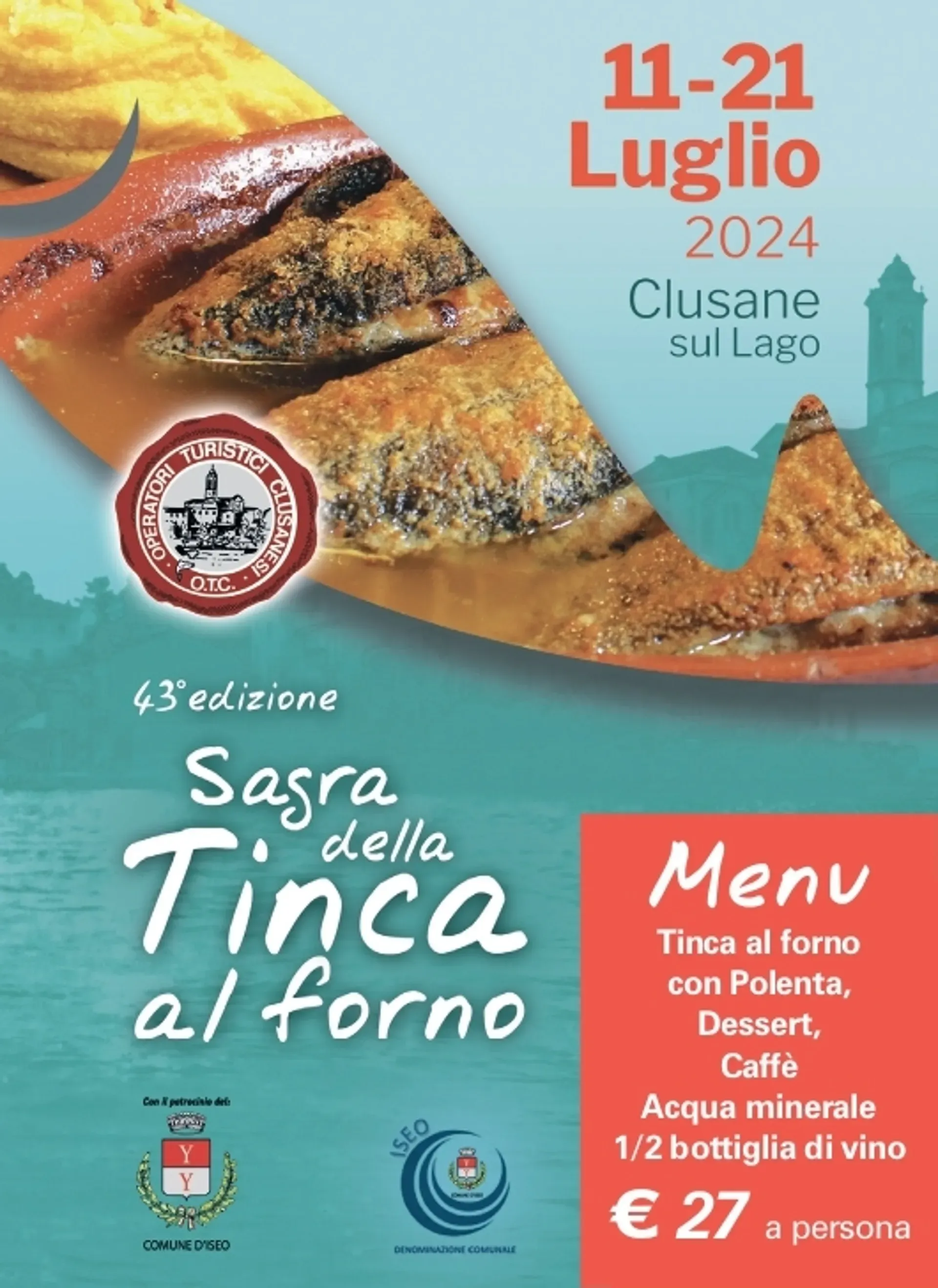 L'’O.T.C. di Clusane con i suoi associati propone la quarantaduesima edizione della Sagra della Tinca al Forno, pietanza tipica del borgo di Clusane d’Iseo.