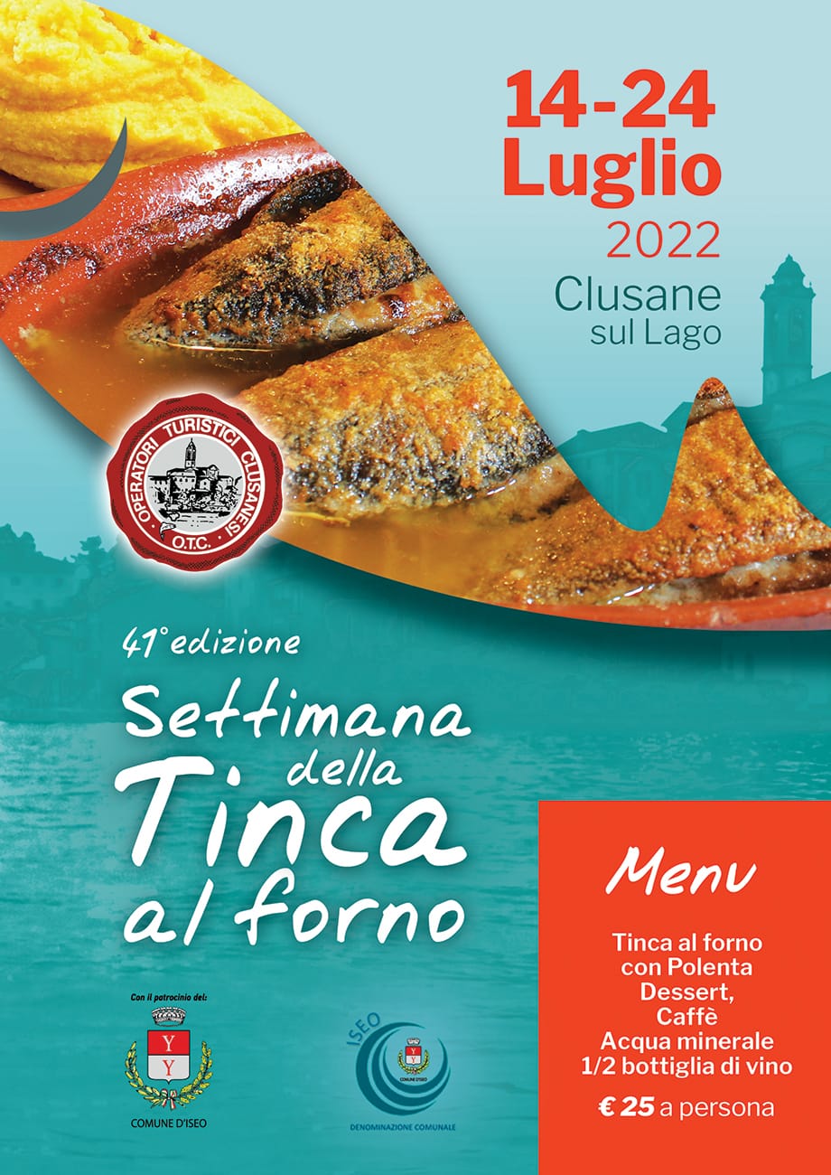 Dal 14 al 24 luglio 2022 a Clusane sul Lago ritorna la settimana della Tinca al forno a cura degli Operatori Turistici Clusanesi OTC. La rassegna vedrà i migliori ristoranti del territorio proporre un menù unificato con tinca al forno con polenta, dessert, caffè, acqua e vino al prezzo fisso di € 25 a persona.