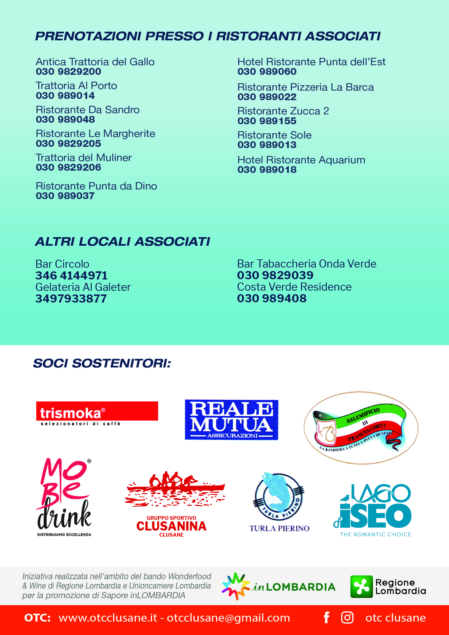 La 42esima edizione della Sagra della Tinca al forno partirà il 13 luglio e, fino al 23 luglio, coinvolgerà tutti i ristoranti tradizionali di Clusane: Antica Trattoria del Gallo, Trattoria Al Porto, Ristorante Da Sandro, Ristorante Le Margherite, Trattoria del Muliner, Ristorante Punta da Dino, Hotel Ristorante Punta dell’Est, Ristorante Pizzeria La Barca, Ristorante Zucca 2, Ristorante Sole, Hotel Ristorante Aquarium. Ogni ristorante cucinerà uno speciale menù dedicato al lago d’Iseo e alle sue specialità, disponibile ad un prezzo speciale. Il menù comprende Tinca al forno con polenta, dessert, acqua, vino e caffè al costo di € 27.