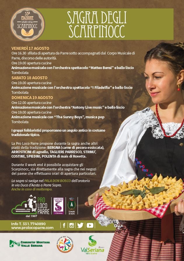 Ore 19.00 apertura cucine Animazione musicale con “The Sunny Boys”, musica pop Tombolata La Pro Loco Parre propone durante la sagra anche altri piatti della tradizione: Bergna (carne di pecora essiccata), arrosticini di agnello, tagliere parresco, strinu’, costine, spiedini, polenta di mais di Rovetta. La sagra si svolge nel Pala Don Bosco dell’oratorio in via Duca d’Aosta a Parre Sopra.