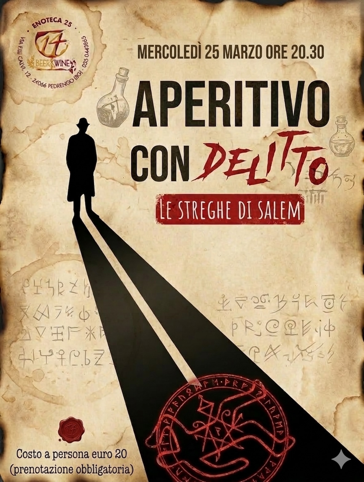Mercoledì 25 marzo alle 20.30, presso Enoteca n. 14, va in scena una serata fuori dall’ordinario «Aperitivo con Delitto – Le streghe di Salem». Un’esperienza coinvolgente che unisce il piacere di un buon calice di vino al fascino intramontabile del giallo.