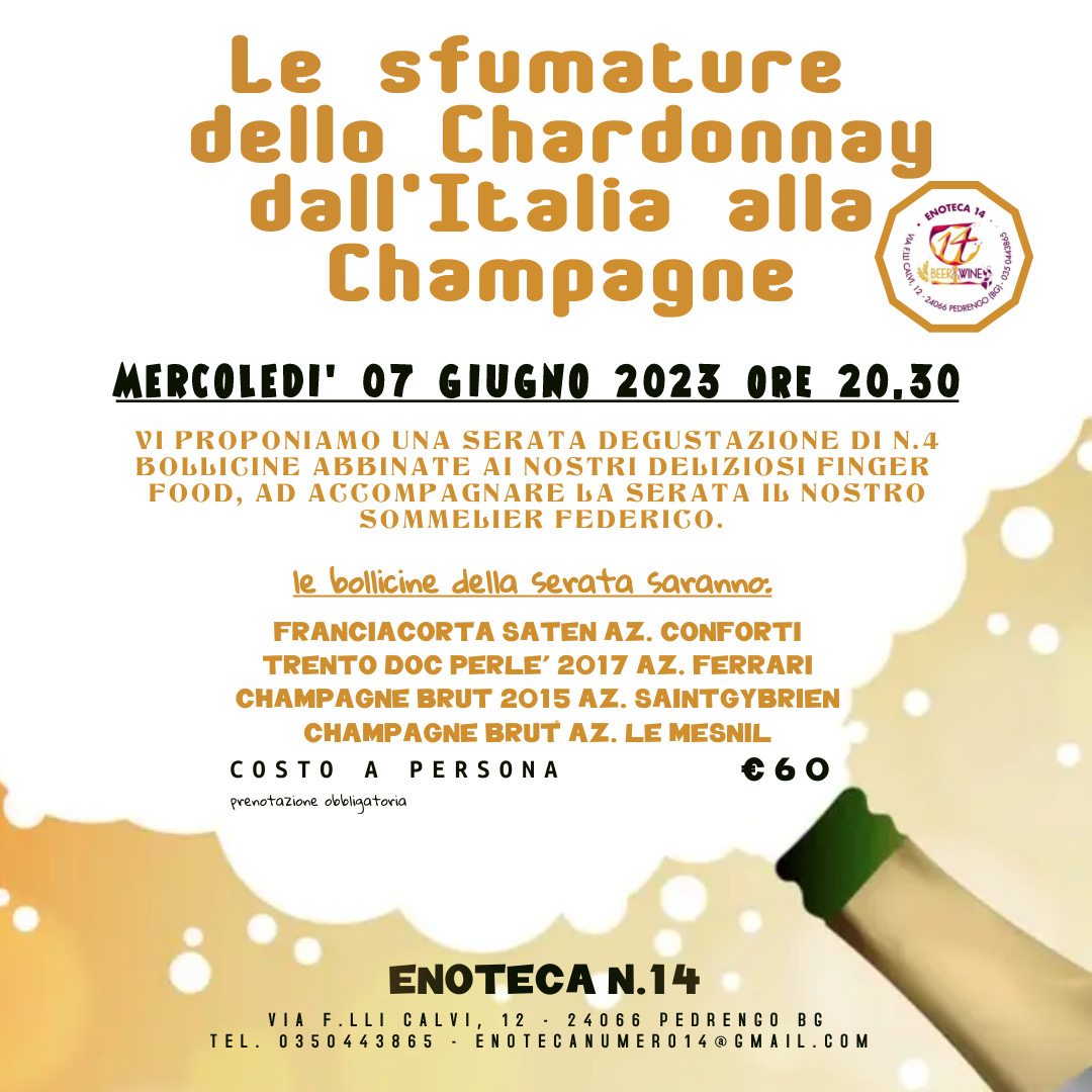Una serata degustazione di bollicine alla scoperta delle sfumature dello Chardonnay, dall’Italia alla Champagne. Le bollicine saranno abbinate a dei finger food e la serata sarà accompagnata dal sommelier Federico.