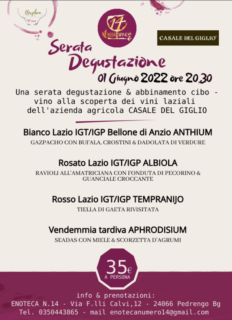 Una serata di degustazione e abbinamento cibo, in particolare verranno proposti dei vini laziali dell'azienda agricola Casale del Giglio.