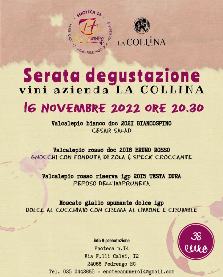 Non perderti una serata all’insegna dei sapori nostrani presso l’Enoteca Numero 14 a Pedrengo! Ad accompagnare le gustose pietanze verranno serviti i vini dell’Azienda Agricola La Collina.