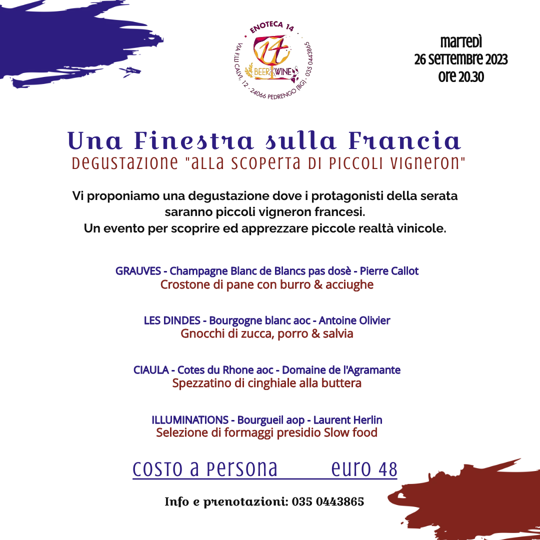 Si propone una serata dove i protagonisti saranno piccoli vigneron francesi. Un evento per scoprire ed apprezzare piccole realtà vinicole.
