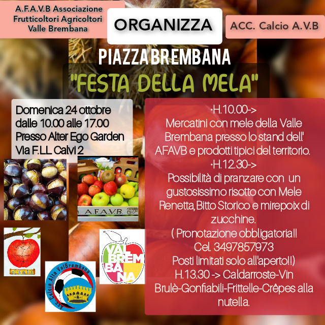 All'alter Ego Garden dalle ore 10 mercatini con mele della Valle Brembana presso lo stand dell' AFAVB e prodotti tipici del territorio.
