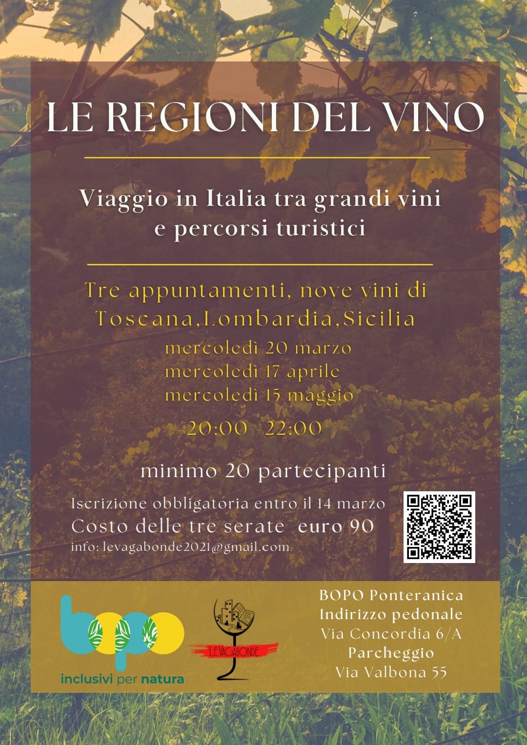 Tre appuntamenti, nove vini di Lombardia, Toscana e Sicilia. Un percorso attraverso la storia del vino e dei luoghi e gli assaggi guidati da due esperte: Frida Tironi, degustatrice e professionista del vino, vi svelerà i segreti della degustazione. Elena Miano, guida turistica e studiosa di storia del vino e del cibo, vi racconterà come la vite è arrivata fino a noi. Ad accompagnare la degustazione un piatto creato dalla cucina del BoPo, in abbinamento ai vini.