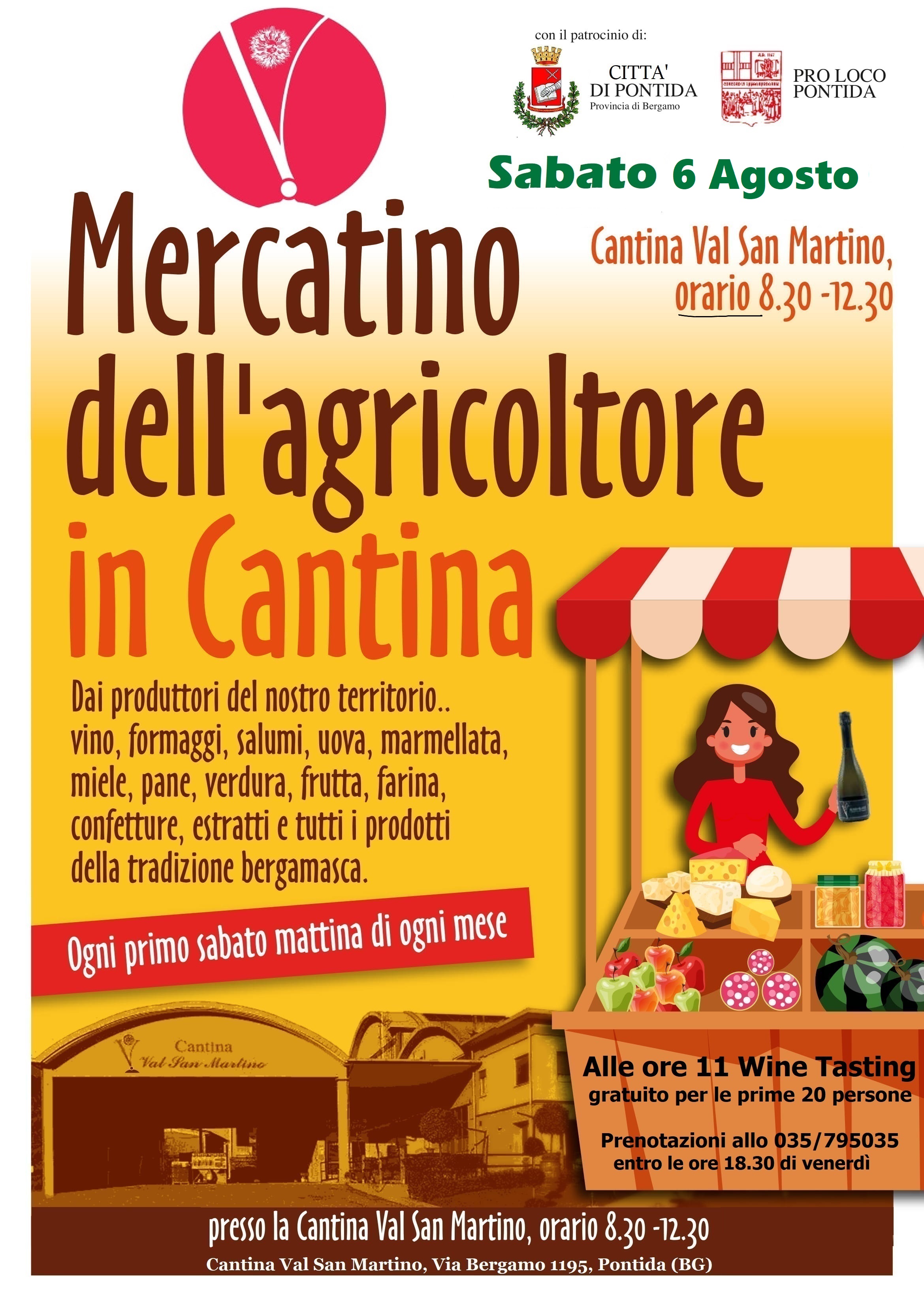 Sabato 6 Agosto, consueto appuntamento, per incontrare i piccoli produttori ed artigiani del territorio, con il "Mercatino dell'agricoltore in Cantina", ogni primo sabato mattina del mese in Cantina Val San Martino a Pontida.