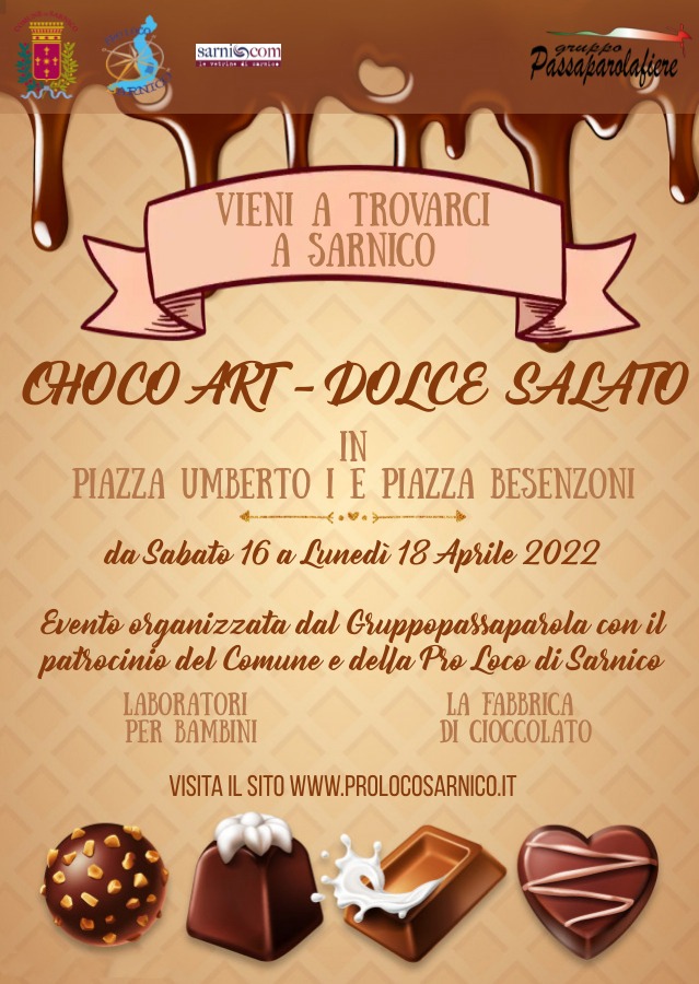 Da sabato 16 a lunedì 18 aprile 2022, presso le Piazze Umberto I e Besenzoni, si terrà “CHOCO ART – DOLCE SALATO”, la Festa del cioccolato.