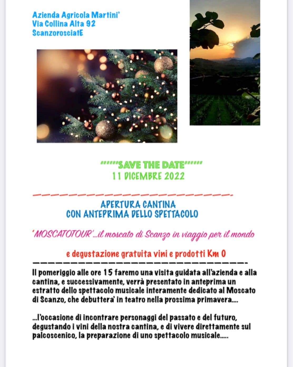 Il pomeriggio l’Azienda Agricola Martinì organizza una visita guidata allo stabilimento e alla cantina con una successiva presentazione in anteprima di un estratto dello spettacolo musicale interamente dedicato al Moscato di Scanzo, il "Moscatour", che debutterà in teatro nella prossima primavera.