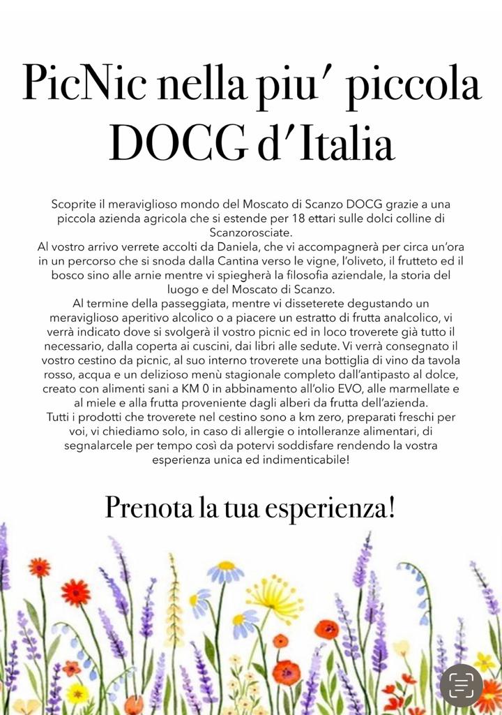 Al termine del picnic, per chi lo desidera, sarà possibile fare una degustazione di grappa o di gin o caffè gratuiti, mentre chi desiderasse degustare un calice di moscato di Scanzo o Giallo passiti potrà farlo al costo di 5 € al calice.