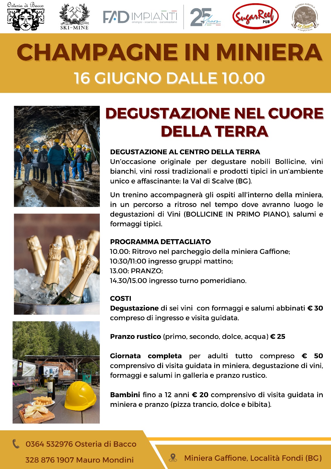 In collaborazione con L’Osteria di Bacco, un’occasione unica per degustare nobili bollicine, vini bianchi, vini rossi tradizionali e prodotti tipici in un ambiente unico e affascinante: le miniere Gaffione di Schilpario!