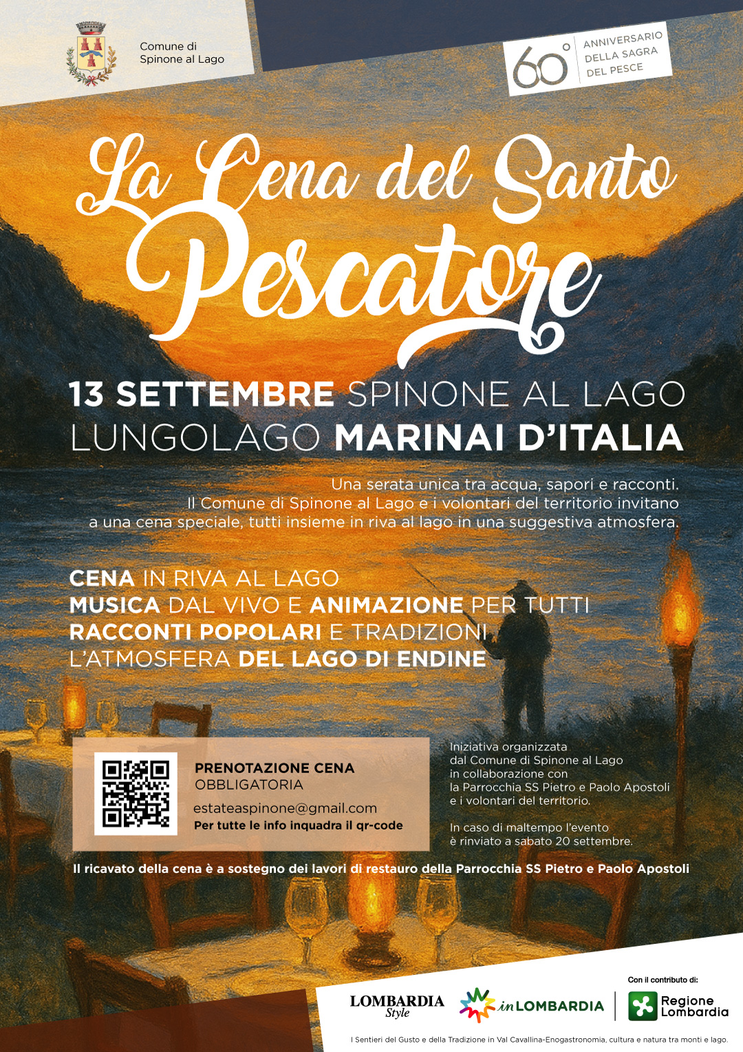 Il Comune di Spinone al Lago presenta l’evento “La Cena del Santo Pescatore” in programma sabato 13 settembre lungo le sponde del Lago d’Endine a Spinone al Lago. L’appuntamento, realizzato in occasione del 60° anniversario della storica sagra dedicata al Patrono San Pietro attiva dal 1965, celebra il più rinomato prodotto del territorio: il latterino fritto.