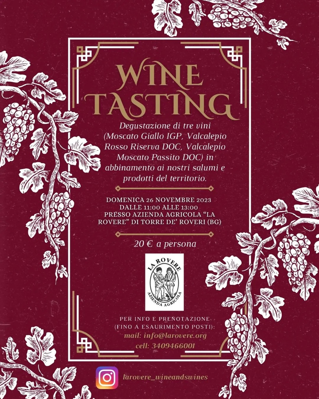 L'Azienda agricola La Rovere, organizza una giornata di degustazione di tre vini (Moscato giallo IGP, Valcalepio Rosso Riserva DOC, Valcalepio Moscato Passito DOC) in abbinamento ai nostri salumi e prodotti del territorio.