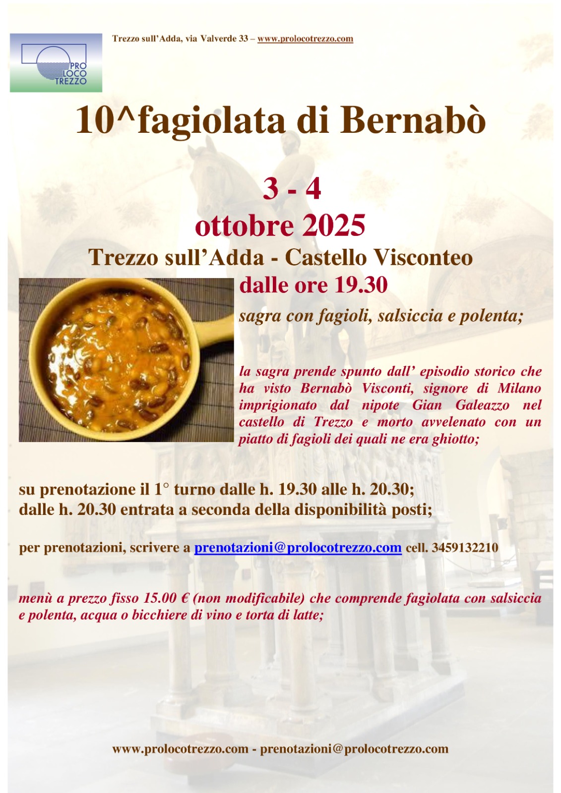 Zuppa di fagioli e tanto al tro al castello di Trezzo! In onore della Sagra del Paese la Pro Loco ripropone a tutti i turisti curiosi un evento culinario, ormai ricercato in tutta la regione per assaporare la golosa ricetta del piatto avvelenato.