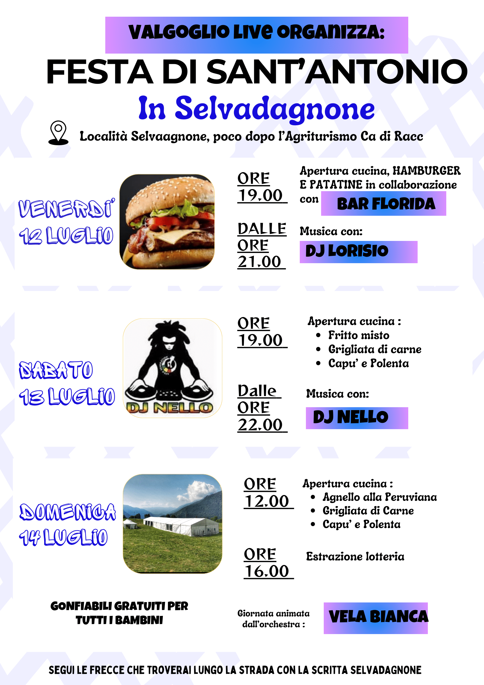 Domenica 14 luglio - Dalle 12:00 apertura cucina con Agnello alla Peruviana, Grigliata di carne, Capu' e Polenta e alle 16:00 estrazione della lotteria.