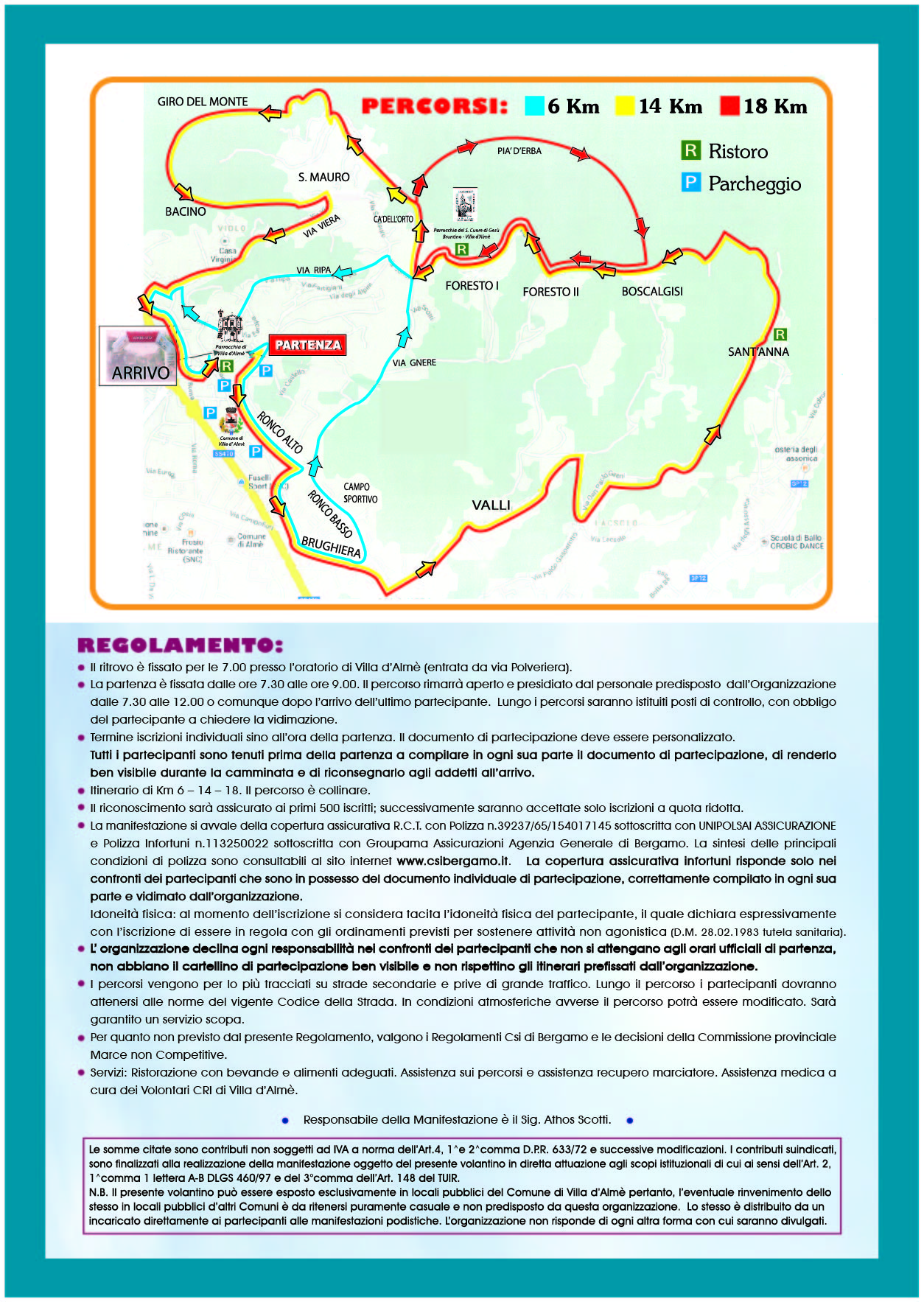 N.B.: L'assicurazione non copre gli infortuni dei partecipanti che non si attengono agli orari ufficiali di partenza, non abbiano il documento di partecipazione con nome e cognome ben visibile e non rispettino gli itinerari prefissati dall'organizzazione. Per il regolamento completo controllare la locandina presente nell'articolo.