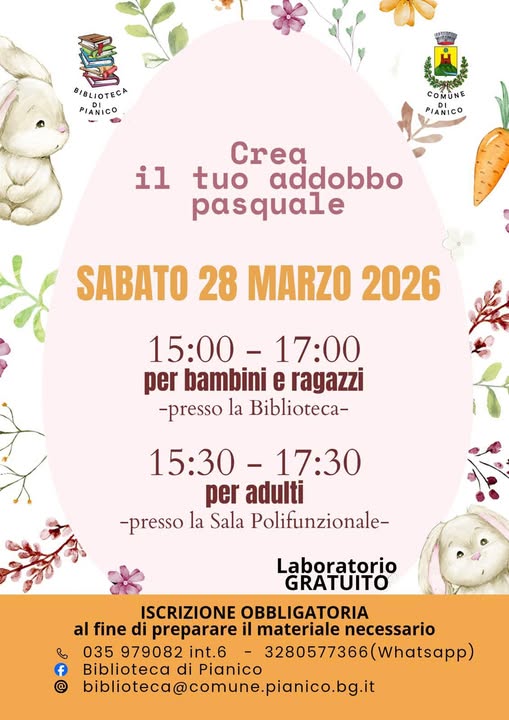 Sabato 28 marzo, il Comune e la Biblioteca di Pianico organizzano durante il pomeriggio, un "Laboratorio Pasquale", per adulti, ragazzi e bambini di tutte le etร , per creare insieme un addobbo per la festivitร della Pasqua, all'insegna della creativitร e del divertimento!