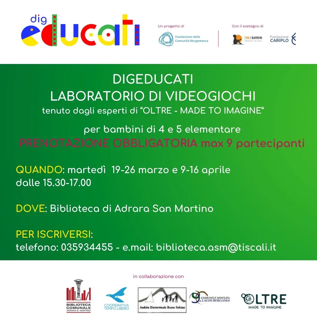 Ultimo appuntamento del laboratorio di videogiochi, martedรฌ 16 aprile presso la Biblioteca di Adrara San Martino.