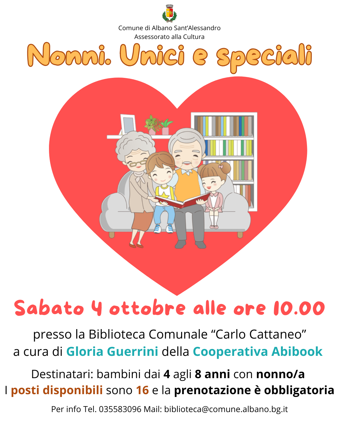 In occasione della "Festa dei nonni", Gloria Guerrini della Cooperativa Abibook, in collaborazione con il personale della biblioteca, accompagnerà i bambini, insieme al loro nonno o alla loro nonna, in un mondo tenero e sorprendente, fatto di bellissime storie in cui i nonni trasformeranno le giornate apparentemente normali o addirittura noiose dei loro nipotini in avventure fantastiche e straordinarie.